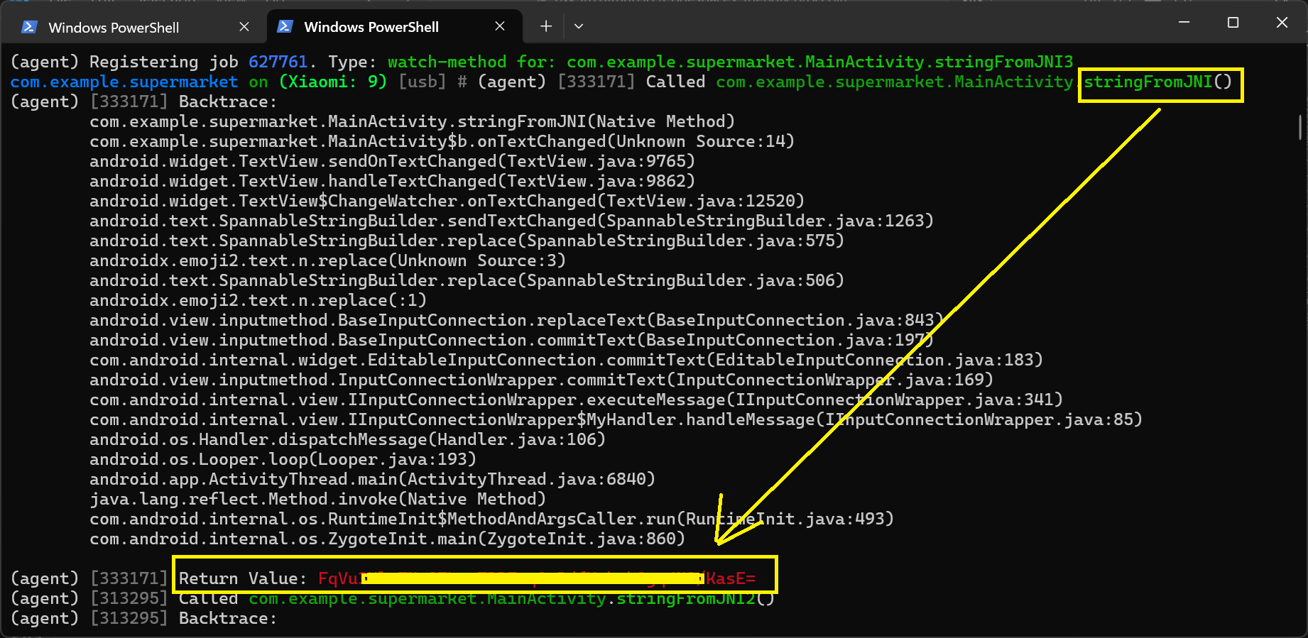com.example.supermarket on (Xiaomi: 9) [usb] # android hooking watch class_method com.example.supermarket.MainActivity.stringFromJNI2 --dump-args --dump-backtrace --dump-return