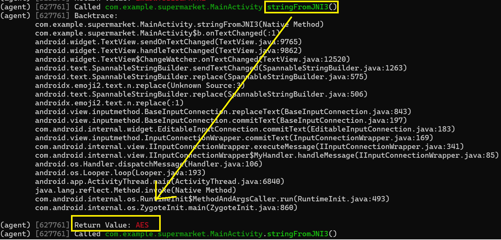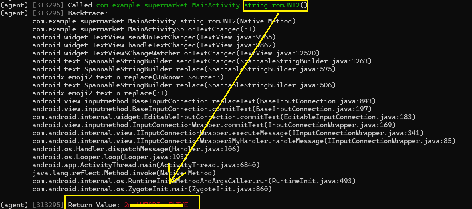 com.example.supermarket on (Xiaomi: 9) [usb] # android hooking watch class_method com.example.supermarket.MainActivity.stringFromJNI3 --dump-args --dump-backtrace --dump-return