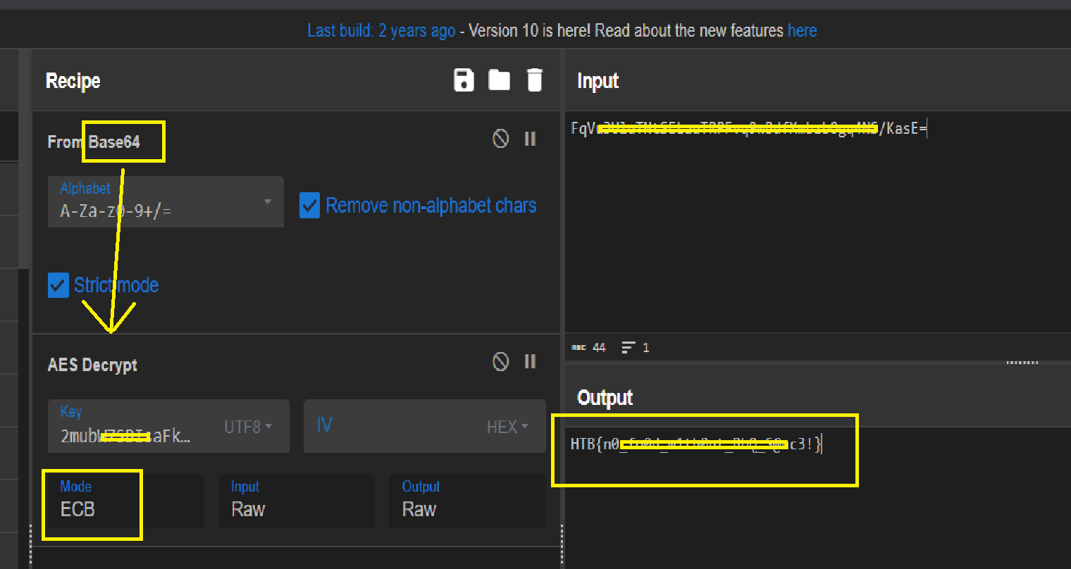 I used the CyberChef website to perform Base64 decoding followed by AES Decryption (ECB mode), and successfully obtained the flag: