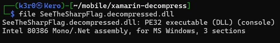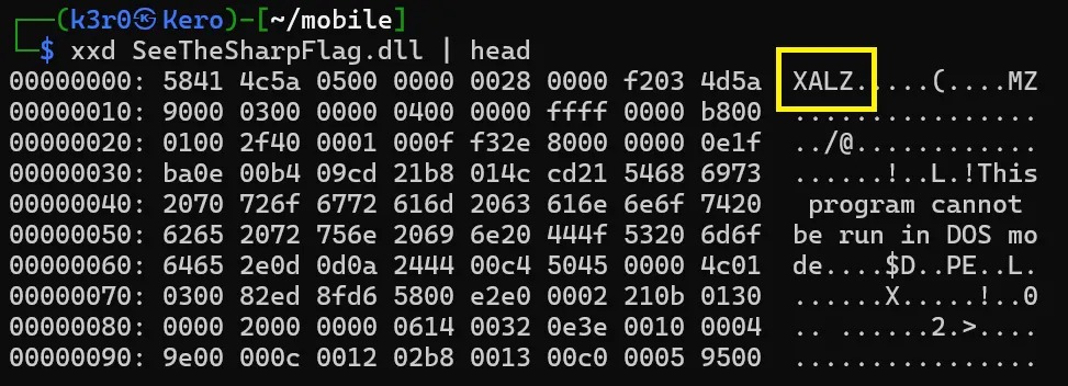 To analyze further, I ran the xxd command and identified a file signature corresponding to XALZ, which is a compressed format used in .NET applications. I then used the