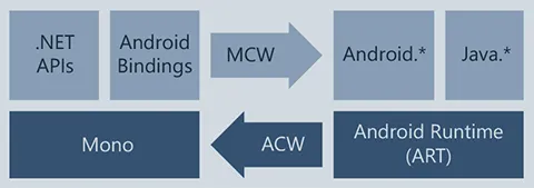 - Managed Callable Wrappers (MCW) and Android Callable Wrappers (ACW) facilitate communication between the Mono and ART environments.